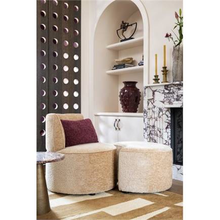 De poefs, het bankje en de fauteuil uit de Roan-serie van COCOmaison zijn door hun vorm perfect met elkaar te combineren. Alle items zijn bekleed met een trendy stof en zijn verkrijgbaar in twee kleuren. Deze okerkleurige poef in de vorm van een halve maan kan perfect aan één van de andere elementen geschoven worden, waardoor je een groter zithoekje kunt creëren. De poef is gemaakt van 40% multiplex, 30% schuim en 30% stof. Een handig detail: er worden twee sets poten meegeleverd, waardoor je de fauteuil op een standaard zithoogte kunt plaatsen, maar ook op een hoogte die geschikt is voor gebruik aan een eettafel. Bij elkaar heeft deze poef een diameter van 59/71 cm en een hoogte van 44 cm.