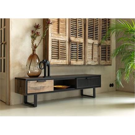 Met zijn 160 cm breed is dit de kleinste variant van het tv-dressoir uit de Avalon collectie. Net als de grote versie van 200 cm breed, heeft ook dit tv-meubel twee verschillende frontjes voor de laden en stoere zwarte metalen accenten. De kleur driftwood geeft dit meubel een heel eigen uitstraling, stoer en een beetje vintage. Er is ook een variant in de kleur oak natural vintage.