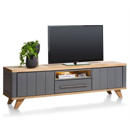 Dit modern landelijke lowboard uit de Jardin collectie van Henders & Hazel is maar liefst 210 cm breed. Een lekker royaal tv-meubel dus. Het lowboard heeft 1 lade, 1 niche en 2 kleppen, handig voor het opbergen van multimedia apparatuur. Praktisch en sfeervol is de geïntegreerde ledverlichting. Het meubel is gemaakt van eikenfineer in de warme kleur Railway Brown, de zijkanten en de fronten zijn van MDF in de kleur antraciet. Het strakke lijnenspel en de kleurencombinatie geven dit lowboard een eigentijdse landelijke uitstraling.