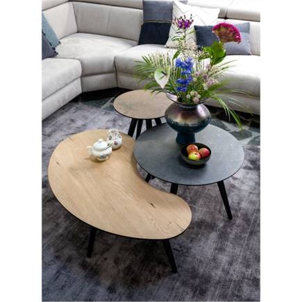 Deze bijzettafel uit de Maze-collectie heeft een speciale niervorm. De kleine bijzettafel combineert daarmee perfect met de ronde Maze-tafeltjes van 40 en 60 cm in verschillende hoogtes. Verschillende bijzettafels gebruiken als salontafel wint de laatste jaren meer en meer aan populariteit. Daarom besloten we om een eigen collectie bij elkaar horende bijzettafels te creëren! Deze bijzettafel met de looks van een nier heeft een tafelblad van 59x100 cm en is 32 cm hoog. Het tafelblad is uitgevoerd in eikenfineer in de kleur railway brown.