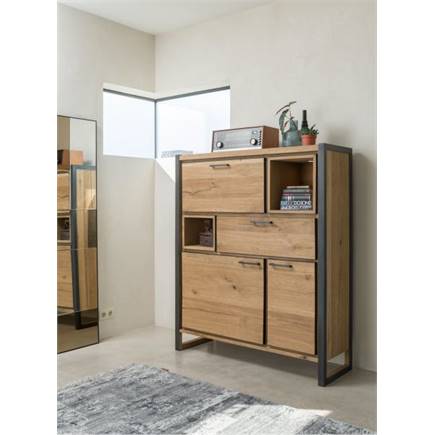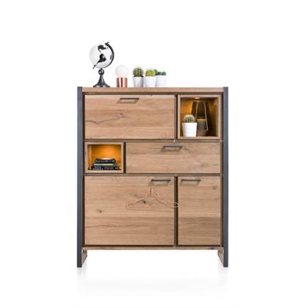 Het highboard uit de Metalo collectie van Henders & Hazel is een moderne, robuuste kast. De combinatie van eikenhout fineer en metaal, zorgen voor een stoer design. De metalen profielen rondom de laden, kasten en niches zorgen voor de finishing touch. Sfeervol is de geïntegreerde led-verlichting in de niches. Gaaf zijn de metalen poten die doorlopen aan de zijkanten van de bergkast. Een fijne kast voor liefhebbers van een stoer en eigentijds interieur.