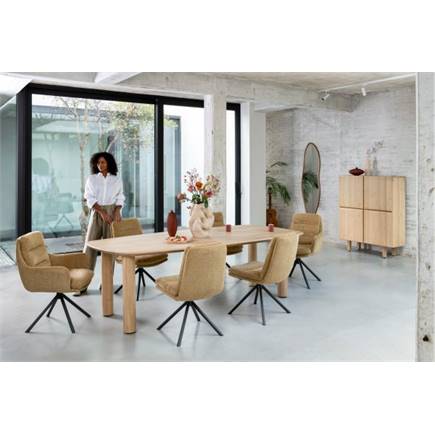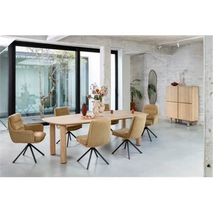 Deze eetkamerstoel Mia heeft een draaibaar centraal onderstel in de kleur grafiet én een uiterst comfortabele zitting. Ook hebben de stoelen een automatische terugdraaifunctie. De stoel is uitgevoerd in stof Livigno, chenille met een zichtbare vleug. Deze stoel is uitgevoerd in de kleur oker. Ook leuk aan deze stoelen: de horizontale stiknaden die in de rug en zitting doorlopen. De stoelen hebben een zitting van 50cm hoog en meten in totaal 90cm hoog.