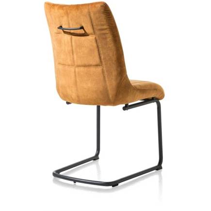 Eetkamerstoel Mischa heeft een eigentijds design. Het zwart metalen swingframe en de veloursachtige stof Karese zorgen voor een mooi contrast van stoer en luxe. Deze variant van Mischa is bekleed in de kleur oker, waardoor de stoel een warme knusse uitstraling heeft. Mischa is in meerdere kleuren en varianten leverbaar. Al deze eetkamerstoelen zijn ook goed met elkaar te combineren.
