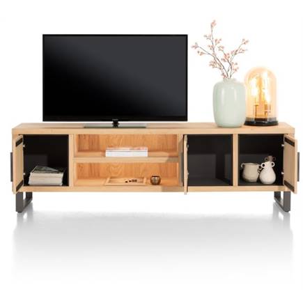 Dit lowboard uit de collectie Pavie is uitermate geschikt als tv-meubel en heeft een retro uitstraling door de lattenstructuur in de kastdeuren. Je kunt bij deze meubels optioneel kiezen voor metalen poten onder de meubels, of de meubels rechtstreeks op de plinten plaatsen. Bij deze collectie heb je keuze uit 2 kleuren: deze versie is uitgevoerd in een natuurlijke houtkleur. Het meubel is 200cm breed en bestaat uit een kastdeur links, een dubbele kastdeur rechts en in het midden twee brede open vakken met ledverlichting. Een ideaal tv-meubel dat in veel woonkamers past, dus!