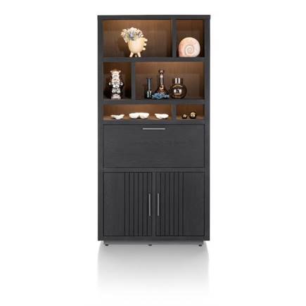 In de collectie Pavie van Henders & Hazel vind je 3 verschillende bergkasten met elk hun eigen karakteristieken. Dit is de middelgrote versie van 100cm breed die bestaat uit 2 ruime kastdeuren onderaan, een deur met klep die horizontaal opent in het midden en een bovenste gedeelte met wel 6 open vakken voor je decoratie. Deze kasten zijn zowel met als zonder zwart metalen poten verkrijgbaar. De kasten kunnen ook rechtstreeks op de plinten geplaatst worden voor een stoere, robuuste look. Ook zijn de kasten verkrijgbaar in 2 versies - Castle Black en in een natuurlijke houtkleur Natural. Deze versie is uitgevoerd in Castle Black.