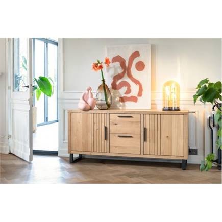 Pavie is een collectie met een retro uitstraling door de lattenstructuur in de rechtlijnige kastmeubelen. De kasten zijn er in twee uitvoeringen: in het industriële castle black en in een natuurlijke houtkleur. Deze versie van het dressoir heeft een industriële uitstraling en meet 175cm breed. De kast heeft 2 grote kastdeuren met massieve lattenstructuur en 2 diepe lades. Met deze collectie kun je dus vele kanten uit! Voor welke uitvoering ga jij?