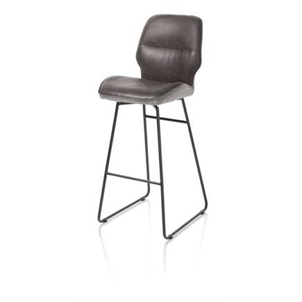 De barstoelen uit collectie Ravi zijn verkrijgbaar in twee hoogtes: een normale barstoel van 98cm hoog met een zitting van 67cm hoog en een extra hoge versie van 114cm hoog met een zitting van 82cm hoog. Dit is de extra hoge versie. De barstoel heeft een modern design met een versmalling in de rug en is uitgevoerd in twee stoffen: vooraan lederlook Secilia en achteraan chenillestof Toba. Deze versie is uitgevoerd in het kleurthema antraciet/grijs.