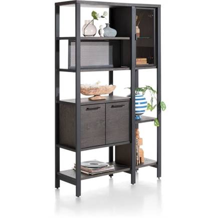 Op zoek naar een multifunctionele roomdivider? Met heel wat open vaken, gesloten kastdeuren en zelfs glazen deuren kun je met dit meubel alles: opbergen, pronken met decoratie en vooral opvallen! De roomdivider plaats je midden in de ruimte, want de kastdeuren en glazen deuren kun je langs beide kanten openen. Lekker handig toch? Deze versie van de roomdivider is uitgevoerd in eikenfineer in de kleur castle antraciet en categoriseren we onder de industriële woonstijl. Het meubel is 120 cm breed, wat best groot is voor een roomdivider!