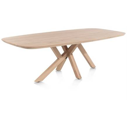 De tafelserie Shimla wordt gekenmerkt door haar Scandinavische look van massief Duits eikenhout en de erg unieke designpoot met atypische kruisvorm. De tafel past perfect binnen de Scandinavische stijl door het ovale tafelblad zonder rechte hoeken. Dit geeft de tafels een zacht karakter. Tafelserie Shimla is verkrijgbaar in 4 verschillende formaten. Hier zien we de uitvoering met een tafelblad van 240x120cm.