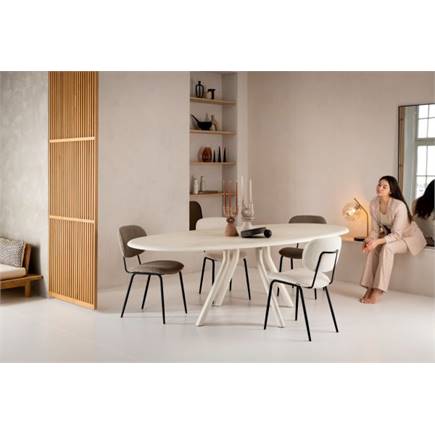 Eetkamertafel LUND is een moderne, ronde eetkamertafel die zich uitstekend leent voor lange avonden tafelen met het hele gezin. De eetkamertafel heeft een licht blad in de kleur nebbia en een centraal, off-black onderstel. De stone-skin afwerking zorgt voor een stoere touch. Voor meer rust in je eetkamer shop je het onderstel in een lichte kleur. Het blad van LUND heeft een diameter van 140 cm.