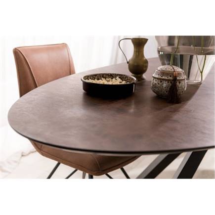 Deze ovale eetkamertafel MASURA in roest look uitvoering mag gezien worden! Het HPL blad is zeer gebruiksvriendelijk en heeft een stoere uitstraling. Het zwart metalen onderstel past daar helemaal blij. De tafel heeft een formaat van 150 x 105 cm en het blad is verkrijgbaar in nog 3 andere kleuren.